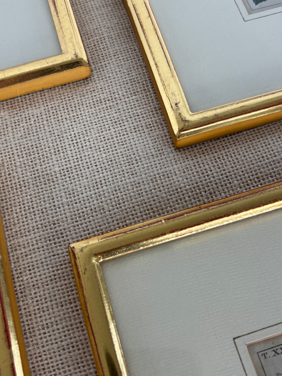 The prints were carefully framed in the mid-20th century using hand embellished and cut mats and framed in gold leafed, custom-made wood frames from a now-defunct, gilding workshop in Aarau, Switzerland and are offered as found from an estate collection in Switzerland. The backs of each piece have dust covers and hanging loops as well as the original framer's sticker. Each framed piece measures 10 5/8" by 8 1/4" by 1/2" deep. Overall, the set is in very good condition, with some patina and wear to the gold on the frames. A lovely traditional and colorful set to add a colorful and natural element to a kitchen, eating area or library.
