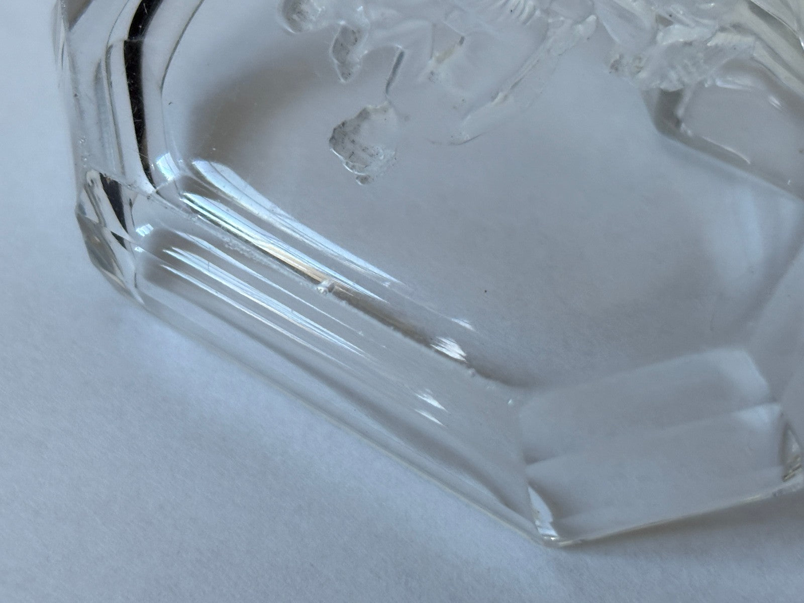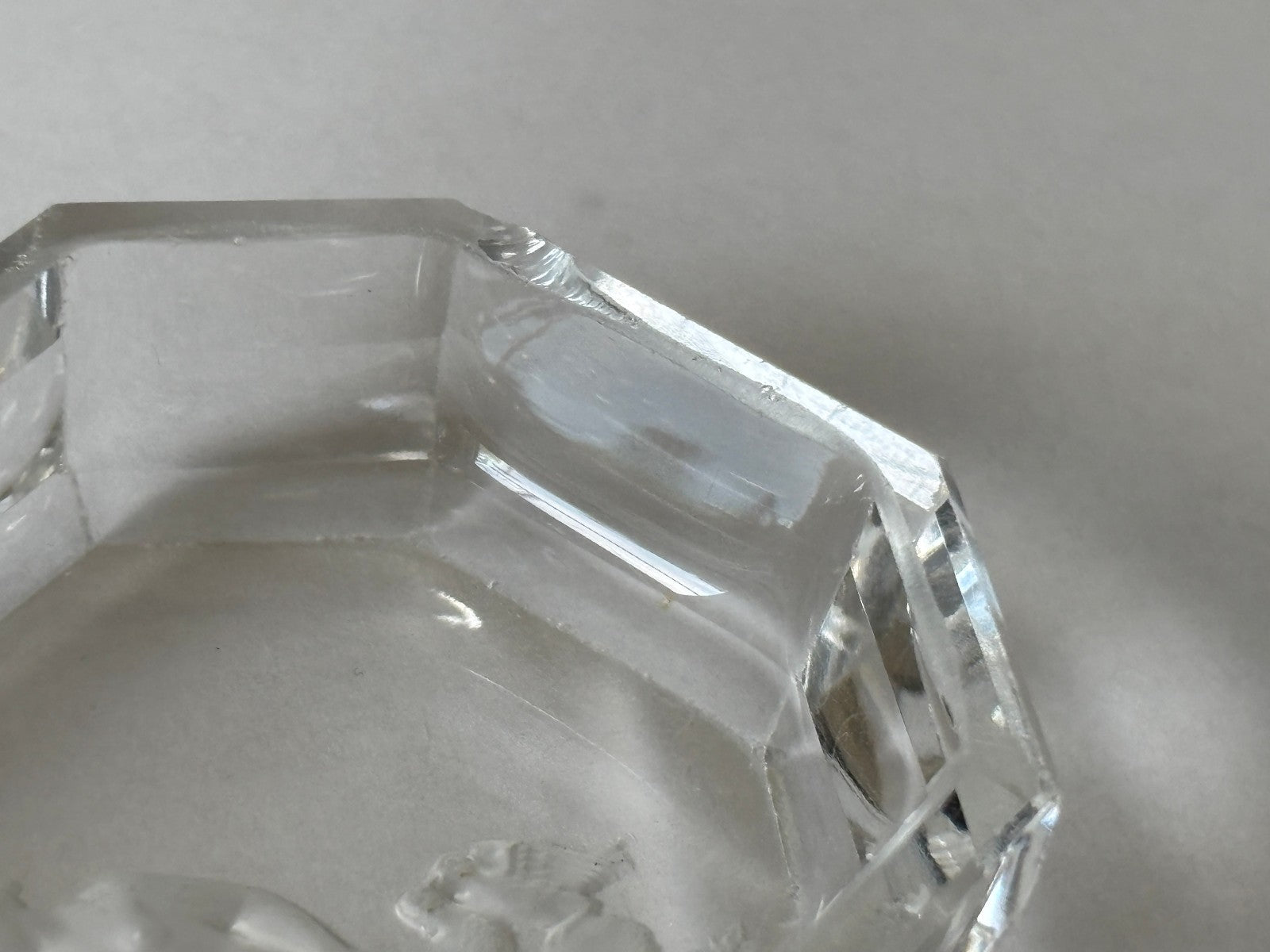 Set of 3, vintage 1920s, Art Deco style, intaglio Art Glass Pin or personal Ash Trays by Heinrich Hoffmann (see Notes below) with a central scene of a seated Venus with a cherub. These high quality, small, 8-sided cut corner rectangular crystal trays were probably vanity pin trays, salt cellars or personal ash trays. They were made by blowing the glass into molds and the accents were etched by hand on the bottom. The motifs show the goddess Venus seated in a garden with cupid and a pair of love birds. The quality of the crystal work for which Hoffman pieces are known, shows especially in the intricate details of the flowers and hair on the figures as well as the draping in the cloth of the clothing. These trays measure 2 3/4" wide, 2 1/8" deep and 3/4" high in the sides. The butterfly mark of Hoffman's crystal operations can be found on the lower right of each little tray. They are in good vintage condition, although some chips on the edges of each tray from use: one on top edge of one tray and small scratches and rough outer bottom edges - see detailed photos. A handsome and charming set of pin trays for a vanity, slat cellars for a dining table or ash trays for a bar, den or comfortable lounge area.
