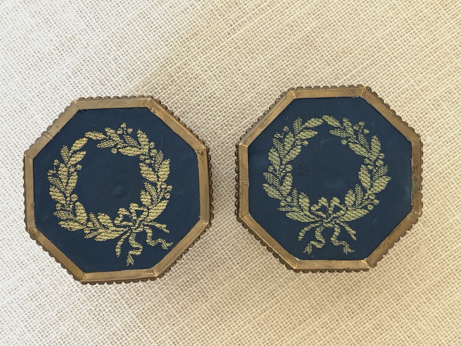 Pair of antique 19th century, Italian red marble octagonal Inkwells or Decorative Boxes with bronze mounts. These French, neoclassical-style boxes with hinged lids and pontiled edge mounts have bottoms covered with blue and yellow woven damask with central laurel wreaths inset in the bottom bronze mounts. The exterior marble sides and both the exterior and interior of the tops are polished while the interiors are honed and still show some striations related to the tools used in cutting the stone. The interior bottoms are covered with brass disks. Each of these boxes measures 2 3/4" high (with lid closed) and 3 1/4" in diameter and weigh a hefty, 1 lb and 9 oz each. The interiors measure 2 1/4" in diameter and 1 7/8" high. These containers are in very good condition with patina commensurate with age and use. Note a slight circular etch mark on the top of one with a small chip on edge of the lid and some scratching to the bronze trim at the back near the hinge of the same one. The interiors of both lids show some etching to the polished surfaces from ink bottles or other items stored inside for some time - see photos for details. A handsome pair of decorative boxes perfect for styling a mantel, a writing desk, a library bookshelf or flanking a centerpiece on a dining table.
