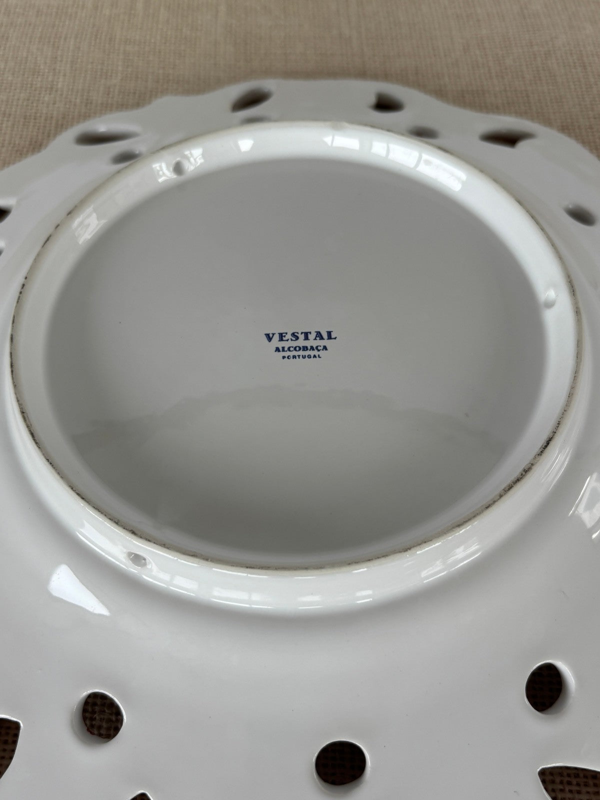 Set of 6, vintage, hand painted floral motif Wall Plates with scalloped and reticulated or lattice / cutout rims in a pink and white colorway by Vestal Alcobaca, Portugal. These plates bear the classic designs of hand painted florals in bright colors, coupled with scalloped and reticulated rims that Vestal has been known for for centuries. Vestal is located in the central coastal area of Portugal, just north of Lisbon between the Alco and Baca Rivers. It is the clay from the se rivers, the power of the river flow as well as the proximity to the beaches for sand that allowed the city to establish and grow its ceramic production. Originally developed in the famous 12th century Monastery of Alcobaca, it wasn't until the 18th and 19th centuries that pottery production in the area became significant. Modernization of the production as well as influence in style from the popularity of Chinese and Deft pottery brought the introduction of blue and white tin glazed earthenware, also known as fiance, which eventually became the Vestal pottery of today. The company's pottery came to the US after WW2 when the company focused on export of tableware in the classic local style of bright glazes and hand painted florals. These plates are a part of that export market and were purchased in the 1970s. This set of plates were originally designed for wall display and all have holes on the bottom rims to allow for easy hanging. The large plate is marked with the Vestal stamp and the smaller plates are simply marked "Portugal" although they carry the classic floral motifs of Vestal and were purchased together. The large plate measures 11 1/8" in diameter and is 1 7/8" high at the rim. The other plates measure 9", 8" 7 3/4" 7 5/8" and 7 3/4" in diameter and are all 1 1/4" - 1 3/8" high at the edge. The set is in very good condition, with no chips, breaks or major apparent ware marks - see photos for details. A stunning set perfect for a decorative plate wall in lovely pink and white!