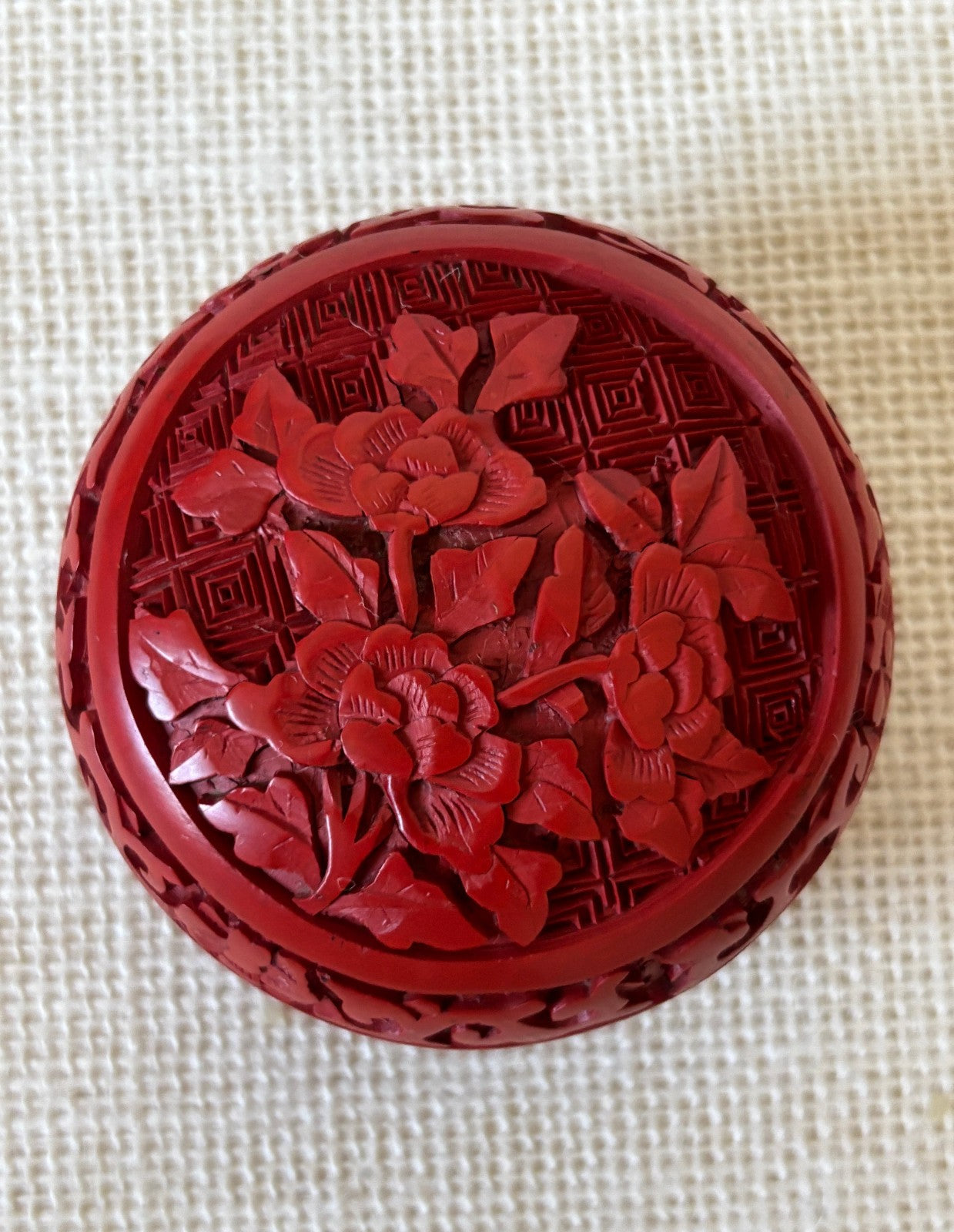 Vintage, hand carved, round cinnabar lacquer Box with domed lid. The top is adorned with peonies with stems and leaves surrounded by Chinese scroll designs. The box measures 2 1/2" wide and 1 3/4" high (with the lid on). Red lacquerware boxes such as this one are made with a turned wood base upon which layers of red-tinted (with cinnabar, a red colored mineral from volcanic areas) lacquer is applied in up to 35 or more layers, air dried and carved. Lacquerwork has been made in China since before the 11th century, being perfected during the Song and Yuan dynasties (1150-1360 AD) when more intricate designs and colors were popularized. Such boxes have traditionally been given as gifts for birthdays, anniversaries or weddings as the red in the lacquer symbolizes longevity and the peonies "Queen of the Flowers" are known to symbolize abundance, happiness and a fruitful life. Small boxes such as this one were used for incense or cosmetics, although in more modern times have become vanity items for rings and other small personal items. This box is in excellent condition, clean and ready to use - see photos for details. A lovely box for gifting or to add a striking note in styling a space or storing a special item.